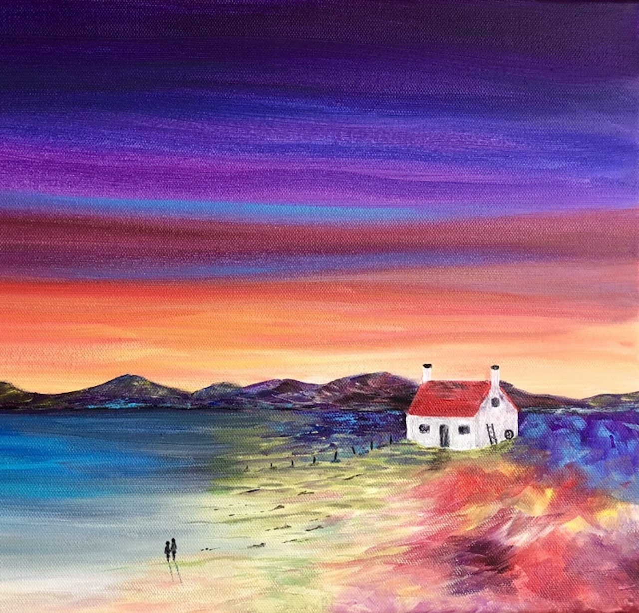 Cute colourful card featuring a red roof cottage by the beach.  The ‘Red Roof Cottage’ was originally designed and painted by Hayley Matthews.  Stunning sky with blues, golds, purple and orange tones.   A beautiful contrast to the light sand on the beach.